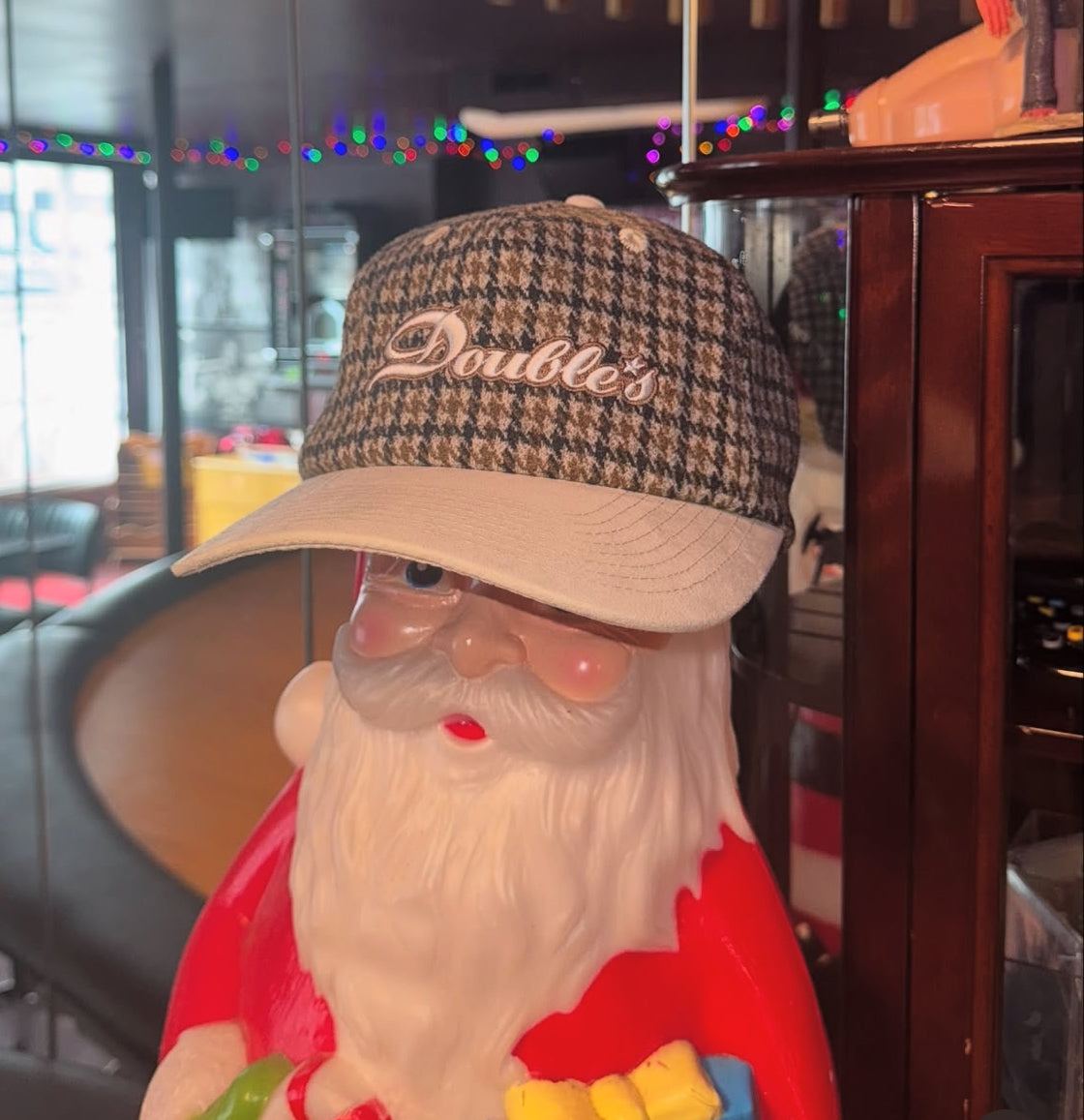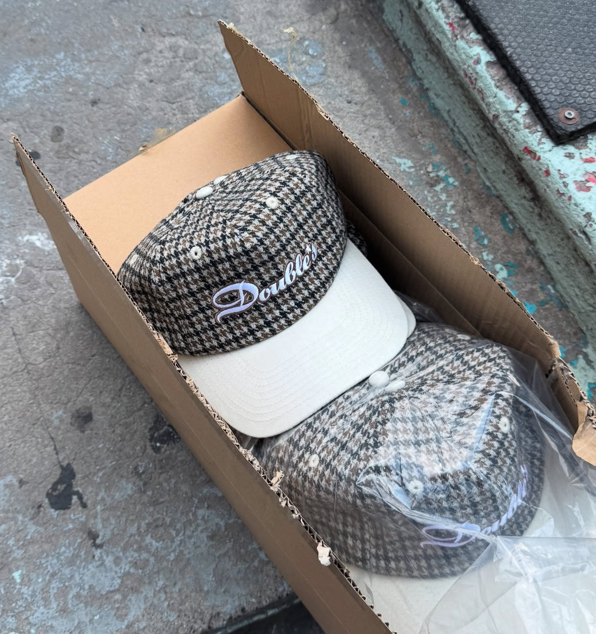 Houndstooth cap with Double's logo embroidered at front, and address embroidered at back.